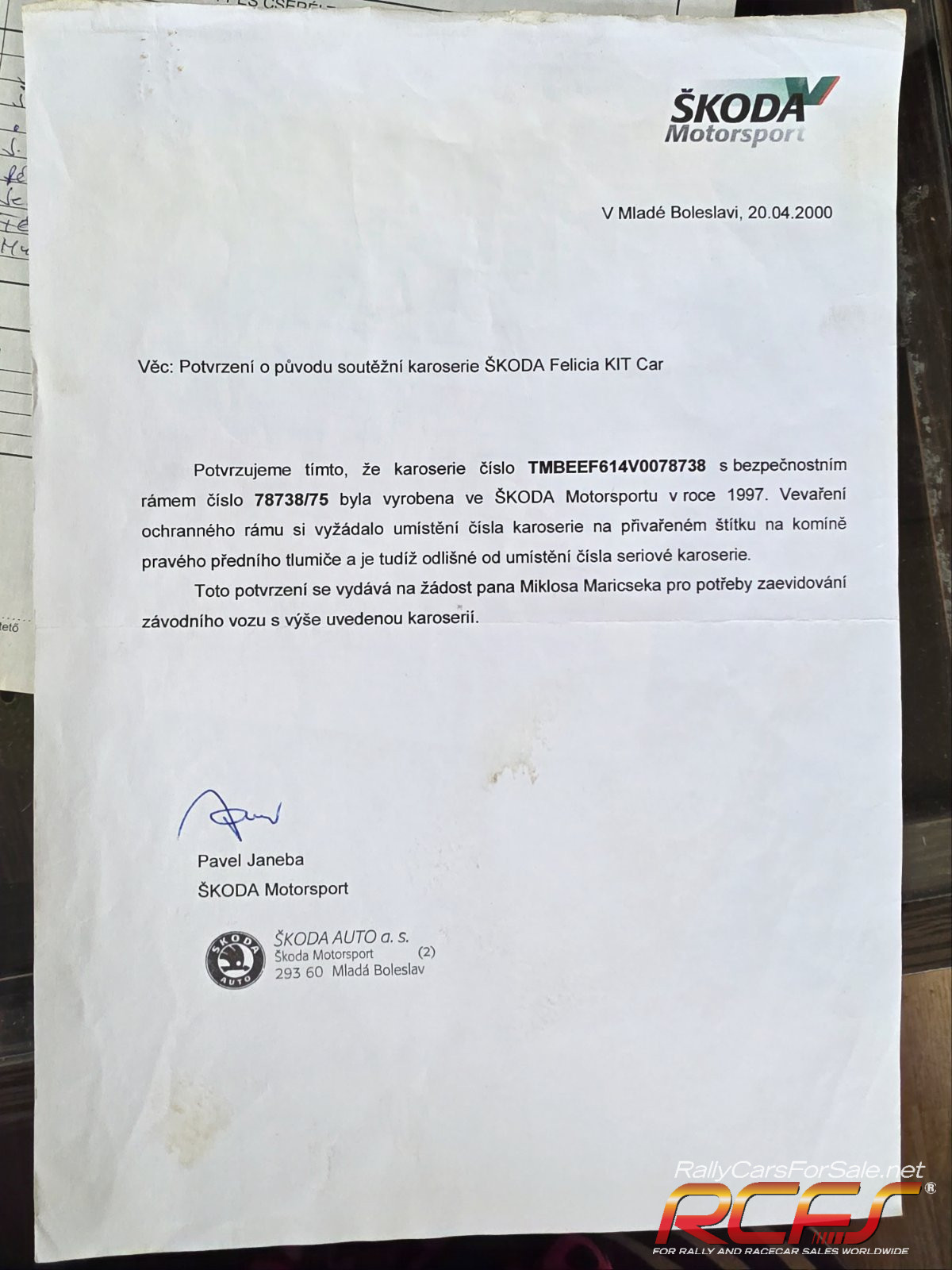 -original Skoda Motorsport Kit Car bodyshell and rollcage