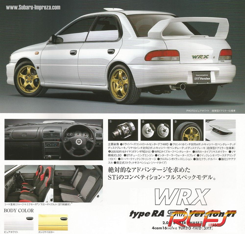 It was the lightest and most advanced road going version of its time, with rally homologation, used to build an absolutely fast rally weapon on special stages. The Type RA model stands for “Rally/Race Altered,” which focuses on being a fully-fledged rally model. It includes weight reduction measures and a range of special upgrades for an incredible driving experience. Being an STI version, it also includes various minor tuning features specific to STI models. Finally, as a limited-edition model, it includes additional unique enhancements:
