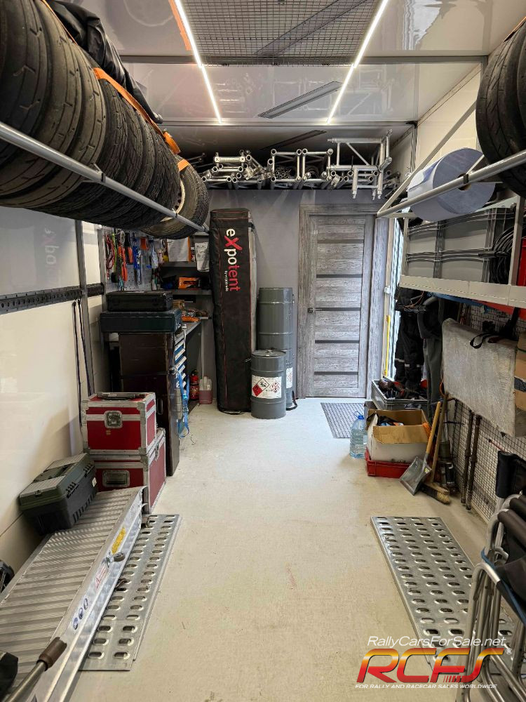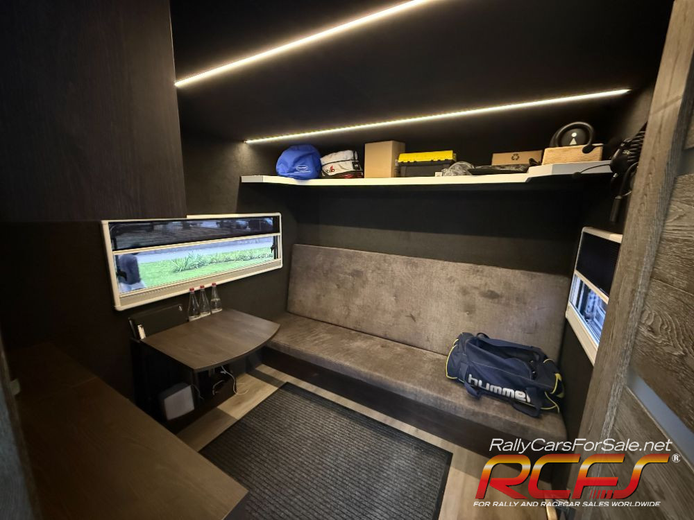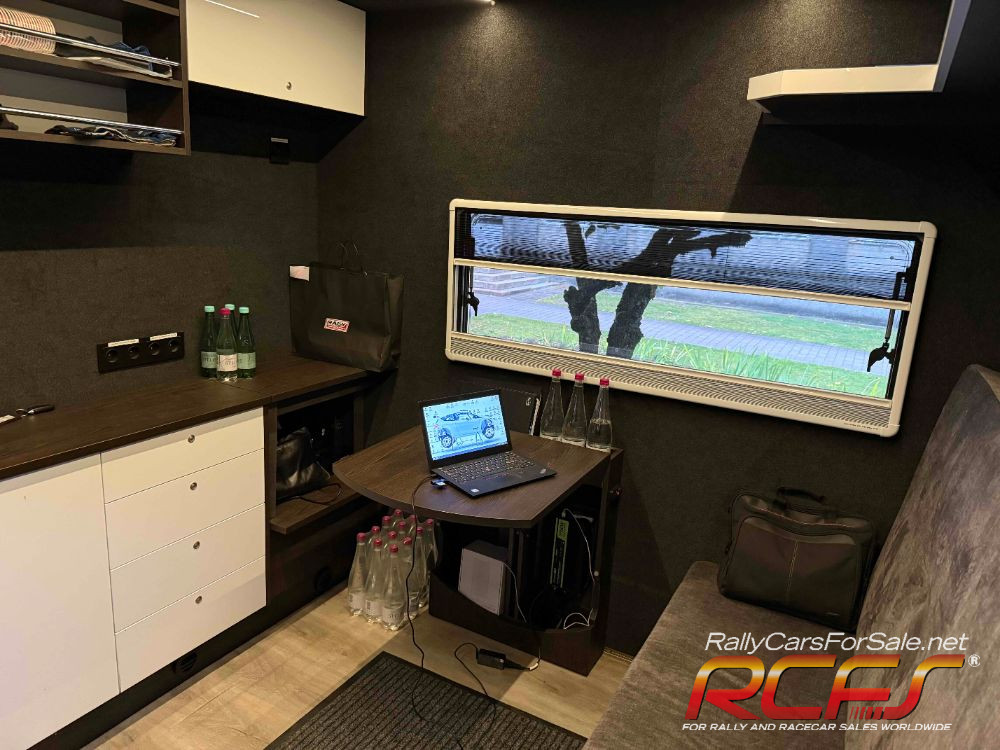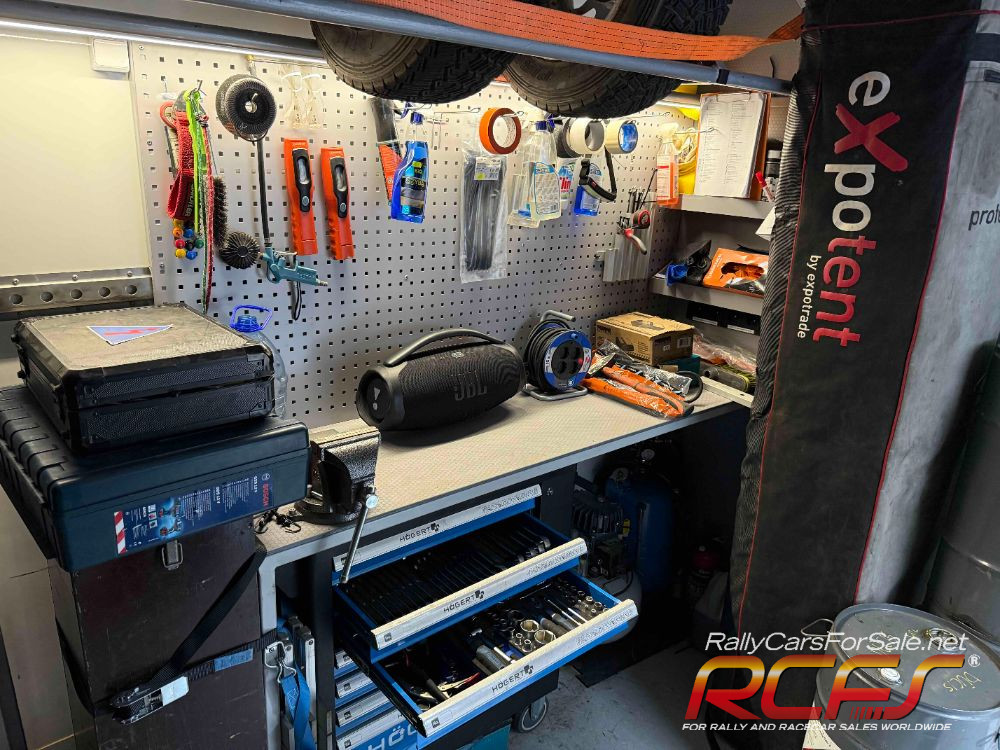 Workshop, transports one car inside, tire stands, shelves, Dhollandia slider lift, external power supply and built-in generator, complete fuse box including control unit and battery charging.